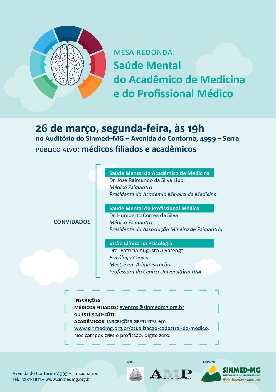 Para mais informações, acesse: http://www.sinmedmg.org.br/visualizacao-de-noticias/ler/11464/faca-sua-inscricao-para-a-mesa-redonda-saude-mental-do-academico-de-medicina-e-do-profissional-medico